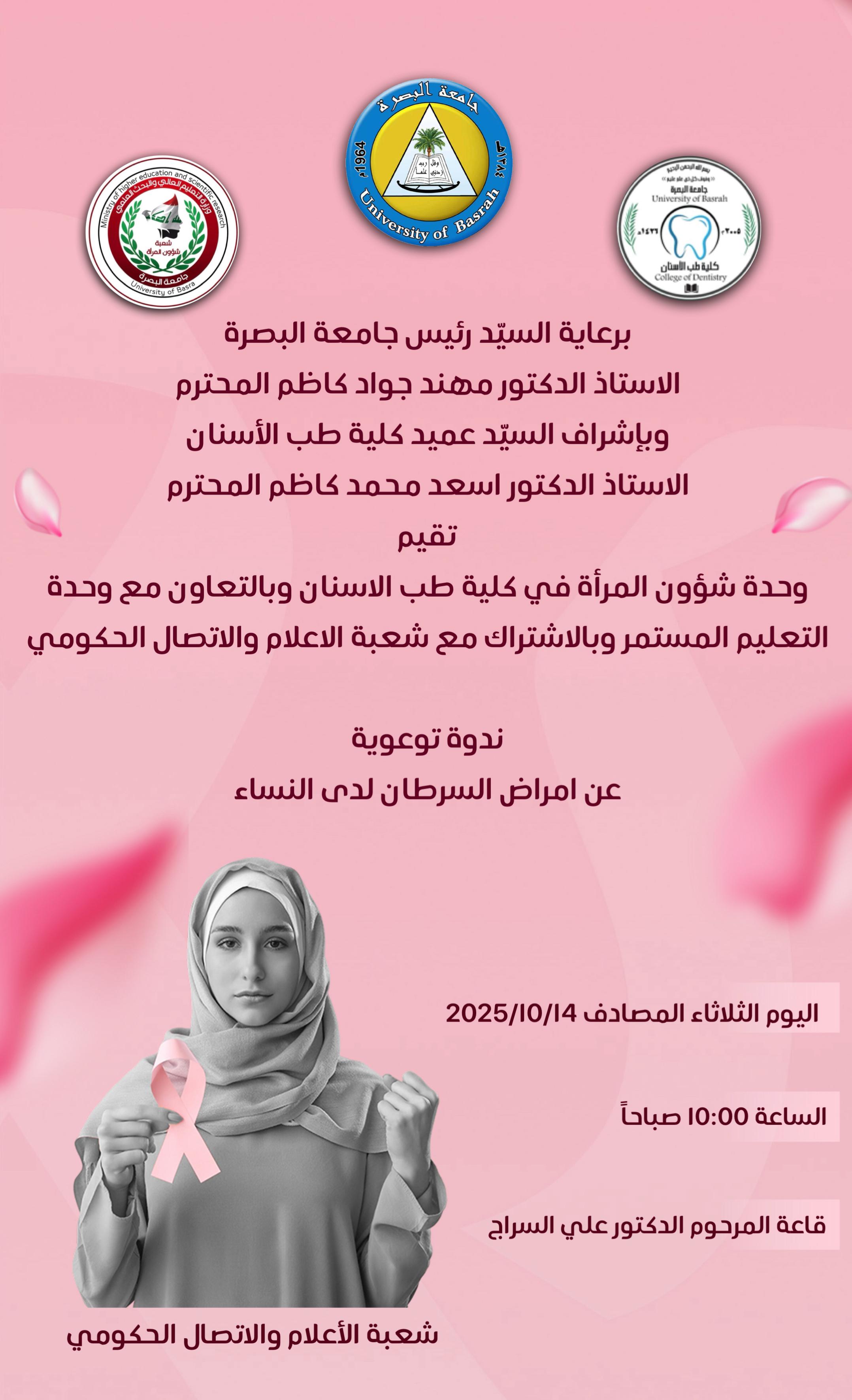 ستقيم كلية طب الأسنان محاضرة ندوة توعوية أمراض السرطان لدى النساء