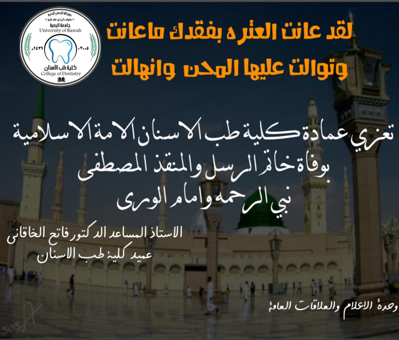 عمادة كلية طب الاسنان تعزي العالم الاسلامي بذكرى وفاة النبي الاكرم محمد صلى الله عليه واله وسلم