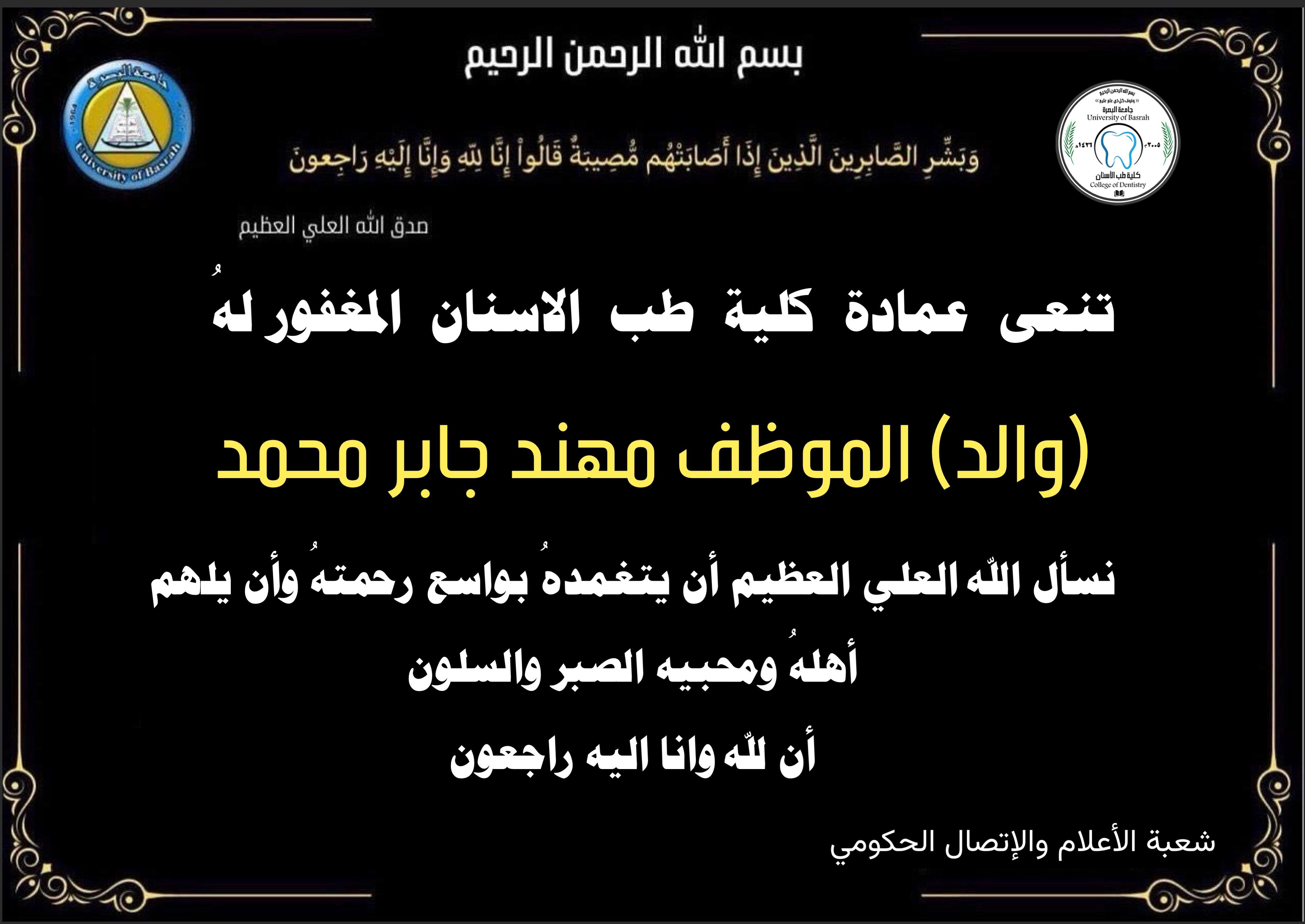 تعزية عمادة كلية طب الاسنان بوفاة والد السيد مهند جابر