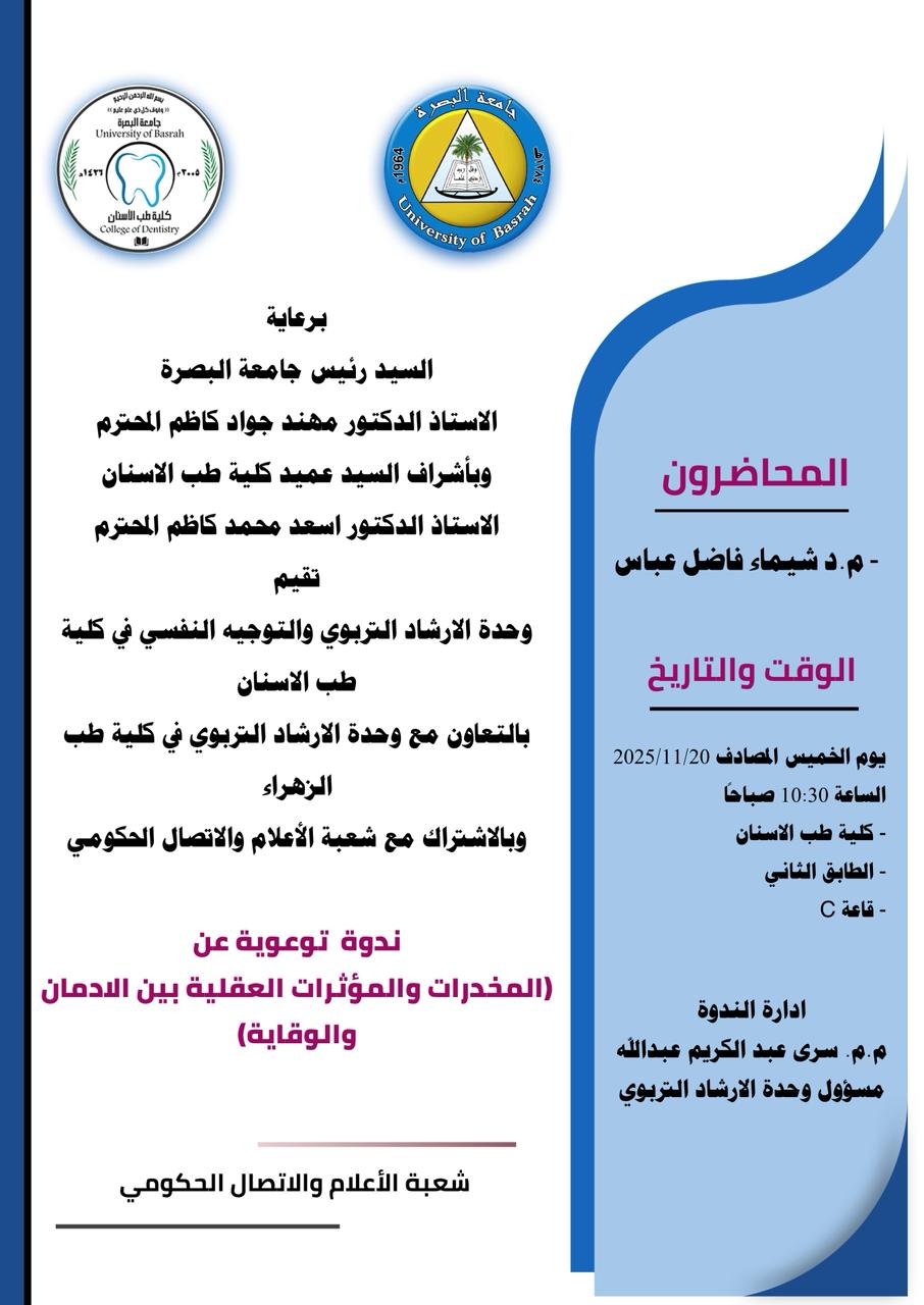 كلية طب الاسنان تقيم ندوة توعوية عن المخدرات والمؤثرات العقلية بين الادمان والوقاية