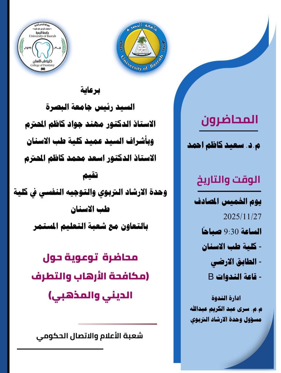 تقيم كلية طب الاسنان محاضرة توعوية حول (مكافحة الارهاب والتطرف الديني والمذهبي)
