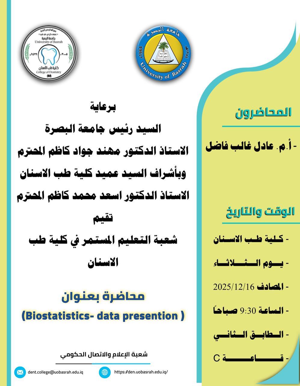 تقيم كلية طب الاسنان محاضرة علمية بعنوان (Biostatistics - data presention)