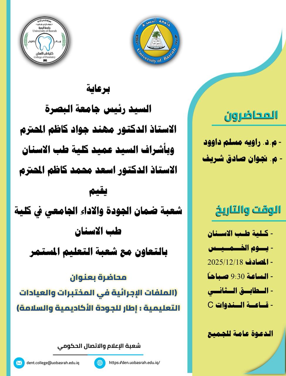 تقيم كلية طب الاسنان محاضرة بعنوان (الملفات الاجرائية في المختبرات والعيادات التعليمية: اطار للجودة الاكاديمية والسلامة)