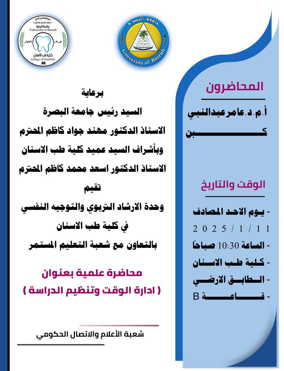 تقيم كلية طب الاسنان محاضرة علمية بعنوان (ادارة الوقت وتنظيم الدراسة)
