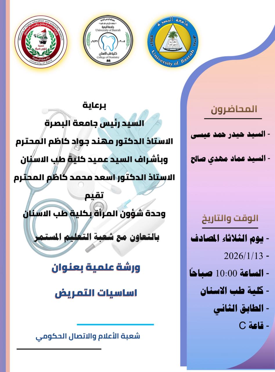 تقيم كلية طب الاسنان ورشة علمية بعنوان (اسايات التمريض)
