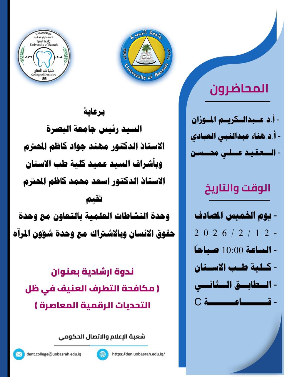 تقيم كلية طب الاسنان ندوة ارشادية بعنوان (مكافحة التطرف العنيف في ظل التحديات الرقمية المعاصرة)