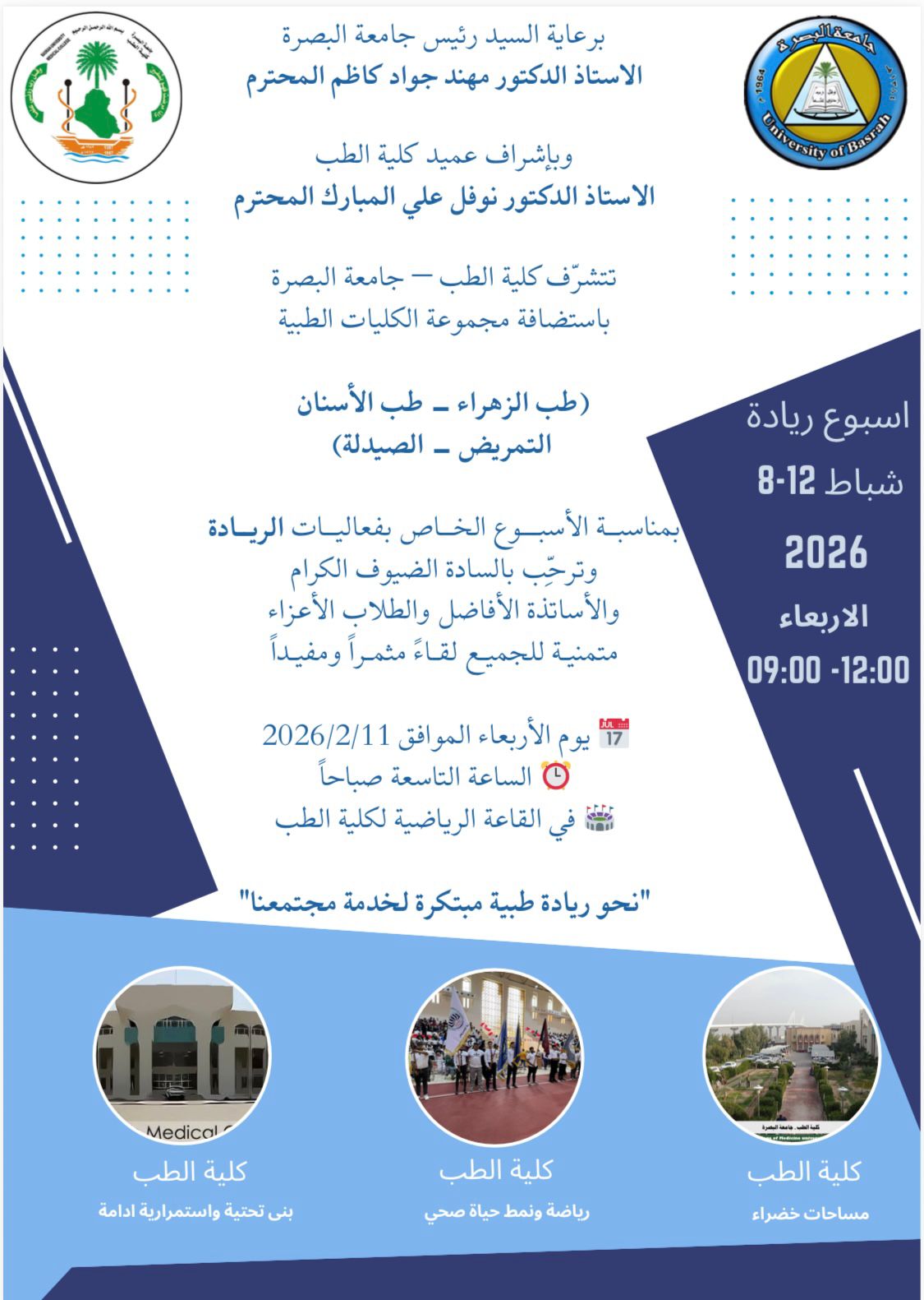 دعوة لحضور اسبوع الريادة لكليات المجموعة الطبية في كلية الطب بجامعة البصرة