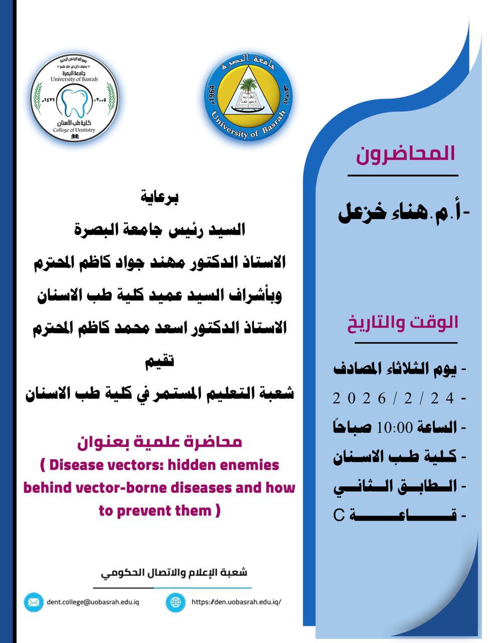 تقيم كلية طب الاسنان محاضرة علمية بعنوان (Disease vectors: hidden enemies behind vector-borne diseases and how to prevent them)