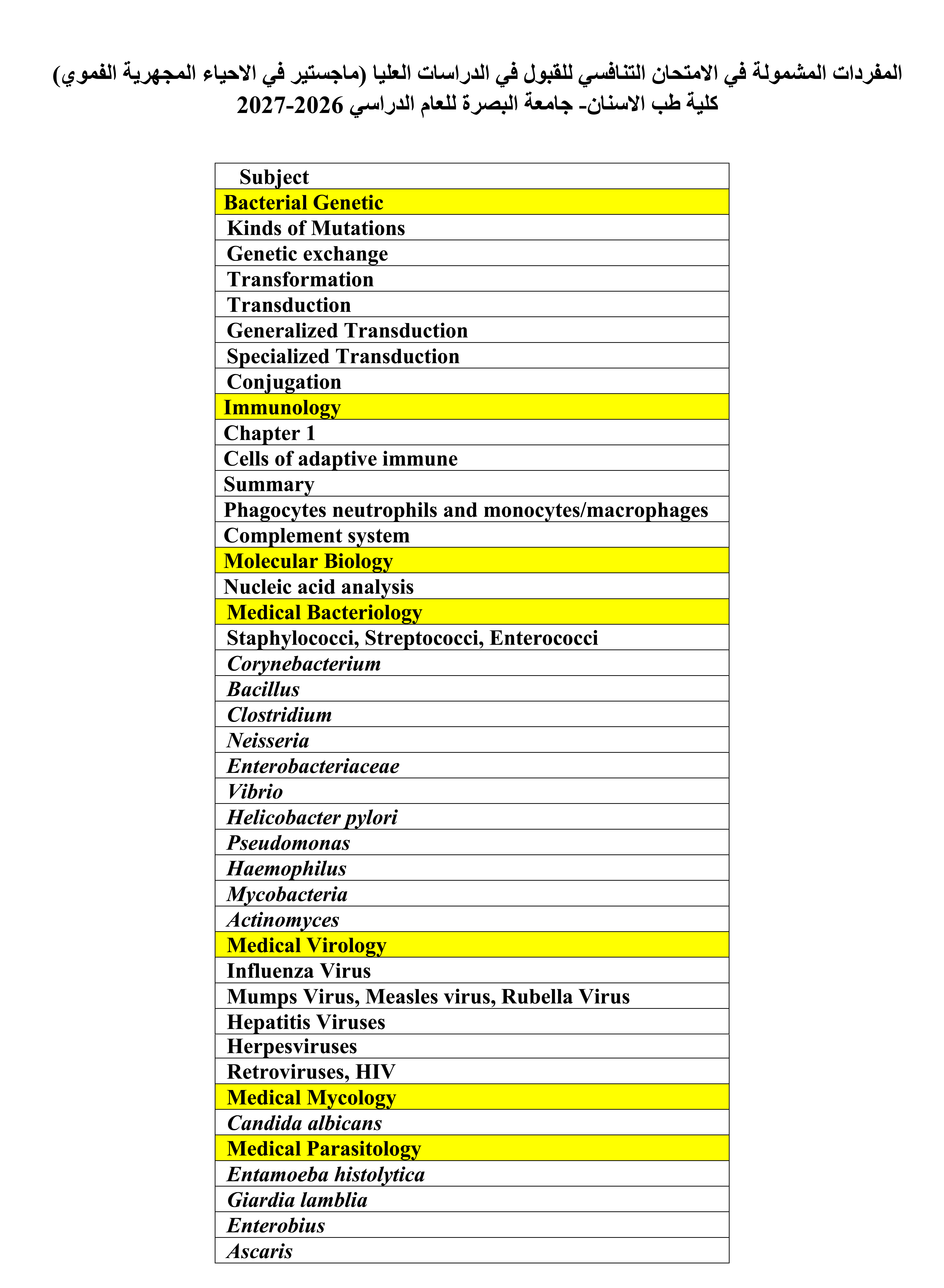 المفردات المشمولة في الامتحان التنافسي للقبول في الدراسات العليا (ماجستير في الاحياء المجهرية الفموي) للعام الدراسي ٢٠٢٦-٢٠٢٧