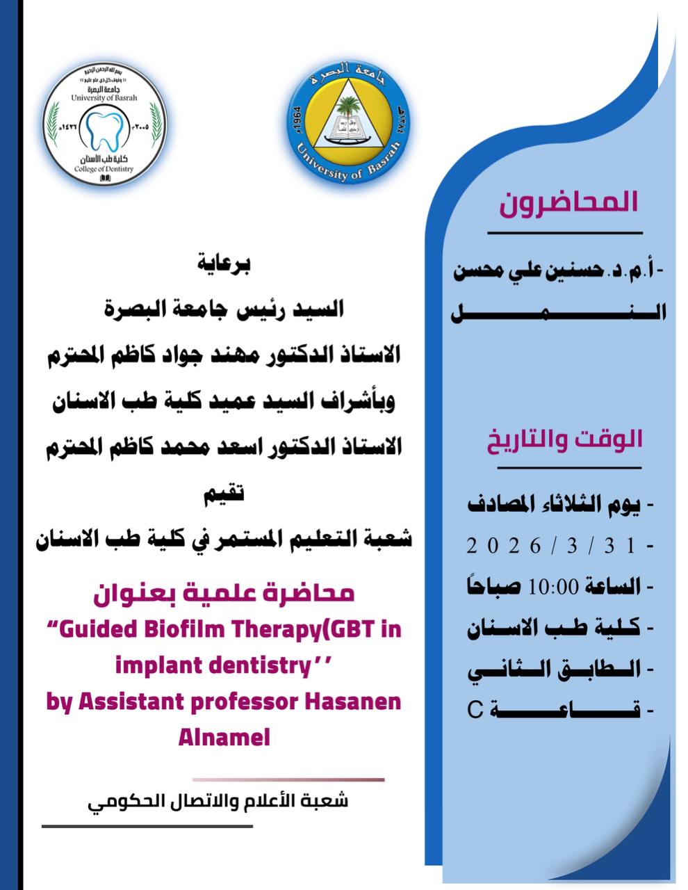 تقيم كلية طب الاسنان محاضرة علمية بعنوان (Guided Biofilm Therapy GBT in Implant Dentistry)