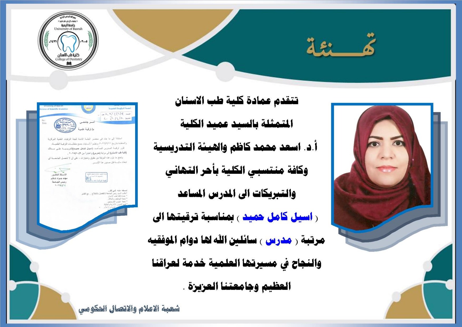 تهنئة عمادة كلية طب الاسنان الى م.م. اسيل كامل بمناسبة ترقيتها الى رتبة مدرس